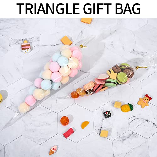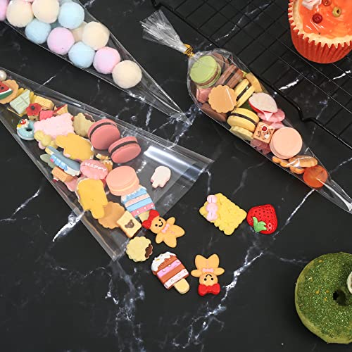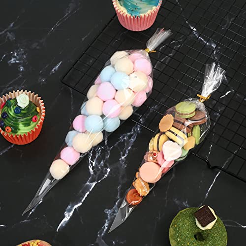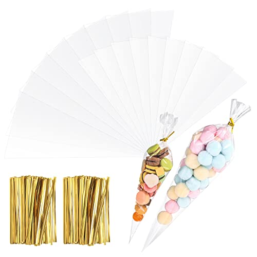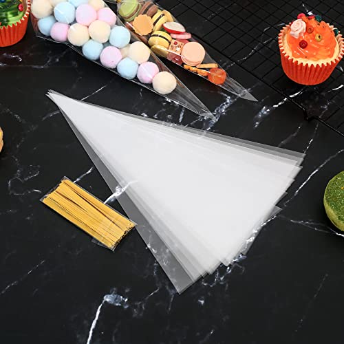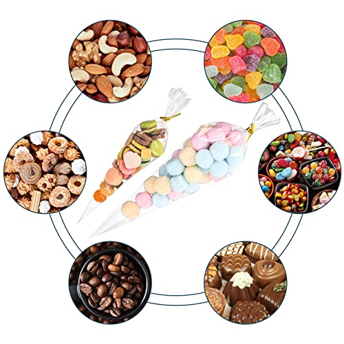 200 Pz Sacchetti per Caramelle, Sacchetti a Cono Trasparenti, Sacchetto Borse Busta in Cellophane per Regalo, Biscotti, Cioccolato, Popcorn, con 200 Pezzi Fascette