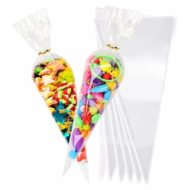 viene fornito con lacci per sigillare i sacchetti trasparenti a cono. Adatto per: puoi usare questi sacchetti per conservare cibi come snack, caramelle, popcorn, cioccolatini, marshmallow, ecc. Si prega di non forzare il riempimento del sacchetto di caramelle, per favore non riempirlo eccessivamente. Imballaggio decorativo: questi sacchetti trasparenti a forma di cono possono essere riempiti con carta