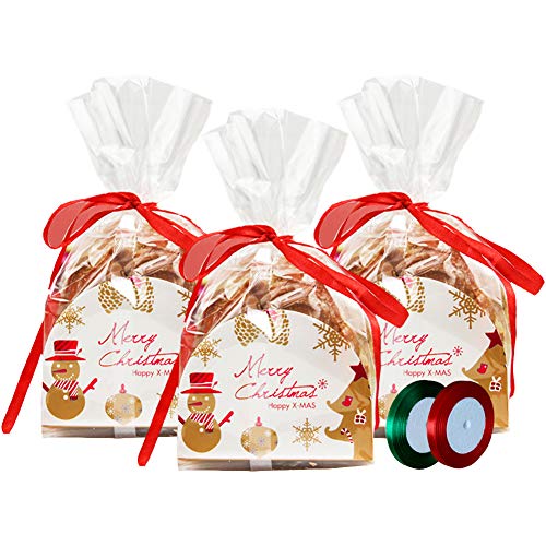 Sacchetti di Cellophane Natale Borse Trasparente Borse Goodies 50 pezzi di sacchetti natalizi con 50 pezzi di carta di buon Natale rosso e 2 rotoli di nastro e forniture per feste di Natale (Style-1)