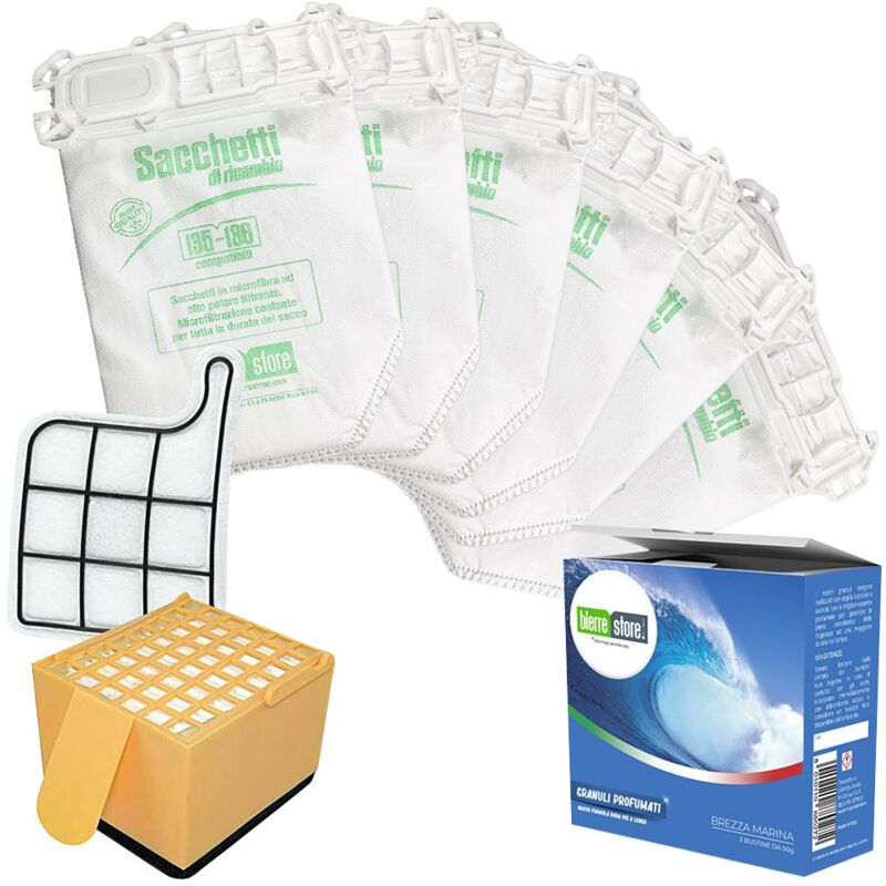 SACCHETTI FOLLETTO VK 135- 136 6 PZ + GRANULI PROFUMATI BREZZA MARINA+ FILTRI COMPATIBILI Sacchetti folletto vk 135 vk 136 6 pz + granuli brezza marina+ filtri compatibili Sacchetti Folletto vk 135 vk 136 in microfibra, filtri e profumi compatibili di qualità superiore controllata e garantita da BIERRE STORE. Kit consumabili per un anno Per garantire il miglior funzionamento del Folletto VK 135 136 si raccomanda la sostituzione del Filtro HEPA e del filtro tela ogni 6 mesi. La confezione garantisce una manutenzione perfetta del Folletto per un anno. I sacchetti in microfibra garantiscono un maggior potere filtrante rispetto ai sacchetti in carta, migliorano la loro resa nel tempo ed evitano spiacevoli rotture. Sono da preferirsi in caso di presenza di persone allergiche dentro casa proprio per la loro capacità di filtrare maggiormente le micro-polveri. I filtri HEPA sono tra i filtri più efficienti disponibili sul mercato, il loro potere filtrante è di oltre il 99.99% di efficienza