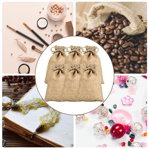 Dimensioni: ca. 10x14cm (intervallo di errore ±0,3 cm), ogni piccolo sacchetto di iuta ha una corda in modo da poter sigillare facilmente il sacchetto ed evitare che gli oggetti interni cadano.