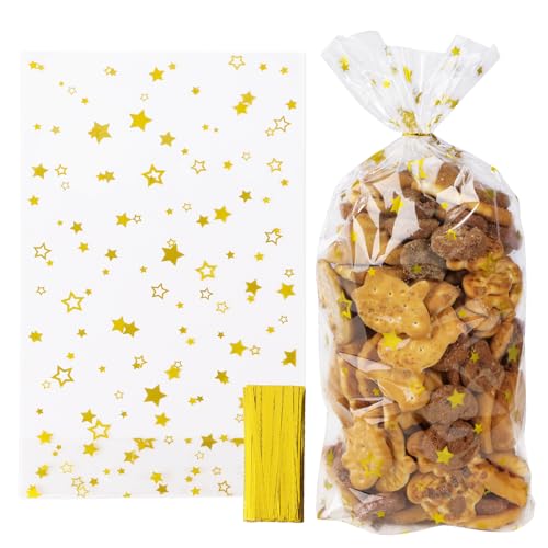 【Design:】I sacchetti di cellophane sono trasparenti con il motivi dorati di stelle, semplici ma eleganti e pieni di atmosfera natalizia. Inoltre, forniamo anche dei legami di torsione per chiudere i sacchetti.