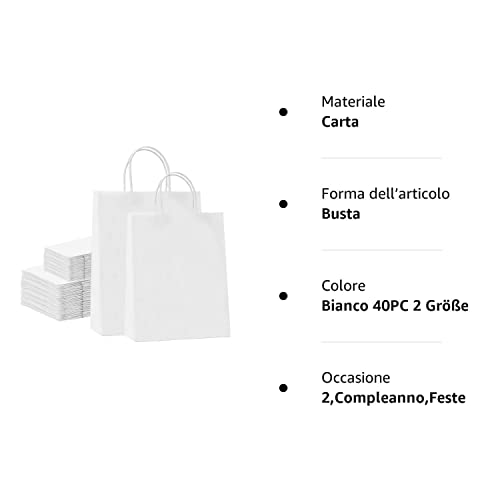 40X Sacchetti Regalo Carta Bianca con Manici, Alimenti Kraft Feste di Compleanno,2 dimensioni