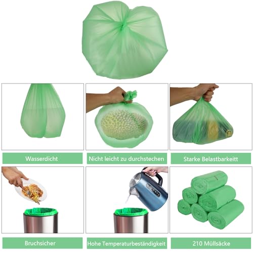 210 sacchetti per rifiuti biologici, 30 litri, 7 rotoli di sacchetti biologici, ecologici, per alimenti, compostabili, per cucina, ufficio, (60 x 50 cm, verde)