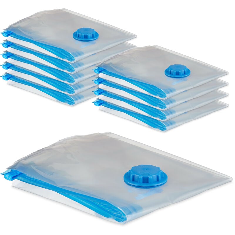 Se l'armadio è stracolmo di vestiti o se desideri sfruttare al meglio lo spazio all'interno della valigia quandoviaggi, i sacchetti sottovuoto sono indispensabili. Riponi i vestiti, le lenzuola o persino le coperte nei sacchi, chiudi la cerniera easpira l'aria dalle vacuum bags con un aspirapolvere. In questo modosi riduce notevolmente il volume del contenuto e si guadagna spazio. Grazie al materiale trasparente, è sempre possibile vedere il contenuto dei sacchetti per il sottovuoto e avere i propri oggetti preferiti a portata di mano. Set da 10 sacchetti sottovuoto per vestiti in dettaglio - Busta H x L: 80 x 60 cm ca. - Ventola H x D: 1,5 x 2,5 cm ca. - Peso: 88 g ca. - Materiale:plastica - Colore:trasparente, blu Sacchi da viaggio salvaspazio - Conservazione salvaspazio per abiti, biancheria intima e molto altro. - Protezione perfetta contro polvere, macchie, umidità o muffa. - Risparmio di spazio in valigie e zaini - ideale per i viaggi - Il materiale trasparente garantisce la