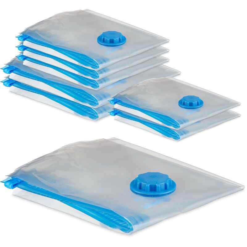 Se l'armadio è stracolmo di vestiti o se desideri sfruttare al meglio lo spazio all'interno della valigia quandoviaggi, i sacchetti sottovuoto sono indispensabili. Riponi i vestiti, le lenzuola o persino le coperte nei sacchi, chiudi la cerniera easpira l'aria dalle vacuum bags con un aspirapolvere. In questo modosi riduce notevolmente il volume del contenuto e si guadagna spazio.Attenzione, non rimuovere la parte in plastica rosa dalla valvola: garantiscela tenuta delle buste sottovuoto. Set da 8 sacchetti sottovuoto per vestiti in dettaglio - Dimensioni della borsa M H x L: 70 x 50 cm / circa 69 g - Dimensione borsa L H x L: 80 x 60 cm / circa 89 g - Dimensione sacchetto XL H x L: 100 x 80 cm / circa 140 g - Valvola H x P: 1,5 x 2,5 cm ca. - Materiale: plastica - Colore: trasparente, blu Sacchi da viaggio salvaspazio - Conservazione salvaspazio per abiti, biancheria intima e molto altro - Protezione perfetta contro polvere, macchie, umidità o muffa - 3 misure diverse per diversi