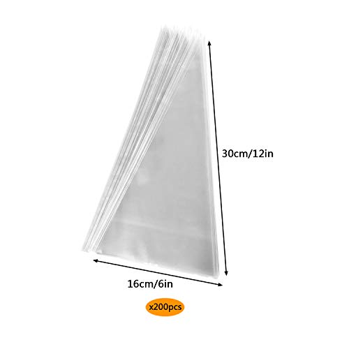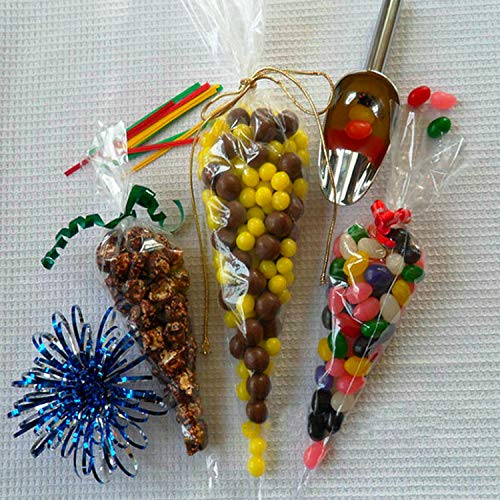 Sacchetti trasparenti a cono in cellophane, con 200 laccetti, ideali per dolcetti, caramelle, popcorn e biscotti fatti a mano, 5 colori assortiti, 200 pezzi