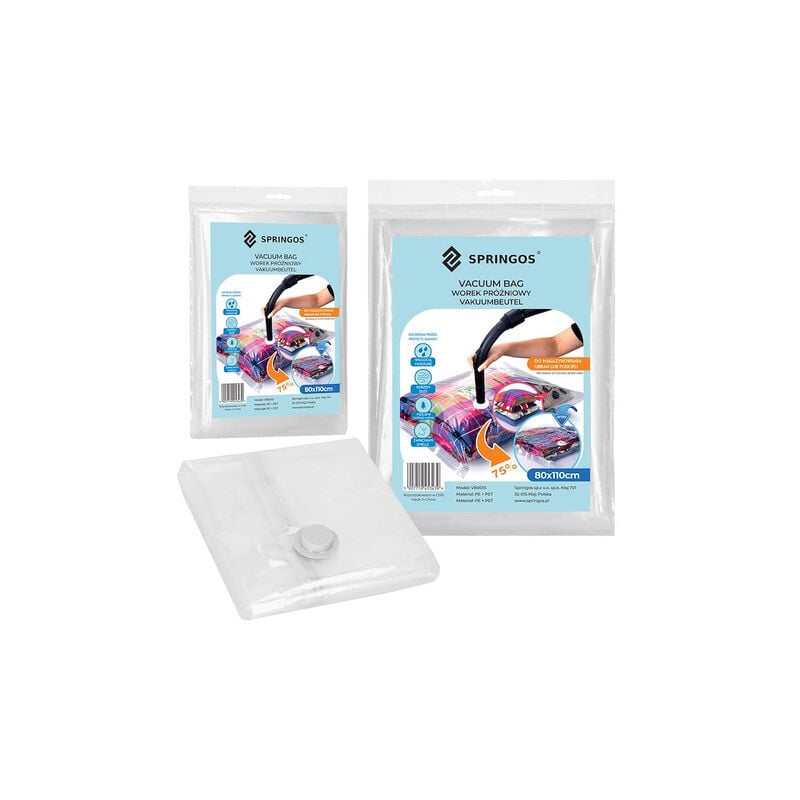 Il sacco sottovuoto della marca Springos è la soluzione perfetta per conservare e proteggere diversi capi di abbigliamento e biancheria da letto. Realizzato con materiali di alta qualità in PA+PE, il sacco garantisce resistenza e protezione dall'umidità, dalla polvere e dagli altri fattori esterni. Il colore trasparente del sacchetto consente di identificare il contenuto senza doverlo aprire, mentre il colore grigio del nastro e del tappo lo rende facile da trovare e aprire. Le dimensioni del sacchetto sono 80x110cm, sufficientemente ampie per contenere capi di vario tipo come abbigliamento, biancheria da letto, cuscini, coperte e tessuti. Il sacchetto consente di ottimizzare lo spazio disponibile minimizzando il volume degli oggetti contenuti. Uno dei punti di forza del sacco è la presenza di un nastro rinforzato con doppio laccio di chiusura. Il nastro resistente garantisce una chiusura efficace, mantenendo l'aria fuori e proteggendo il contenuto dai fattori esterni. Grazie alla