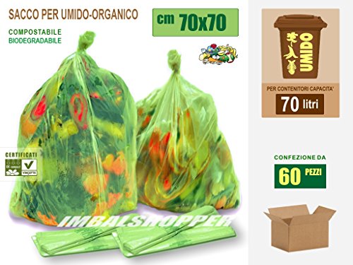 Sacchi per Raccolta Umido Organico, Compostabili Biodegradabili | cm 70x70 (70 litri) Scatola da 60 pezzi