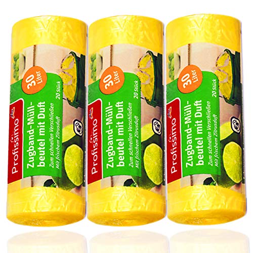 Sacchi della spazzatura con nastro di scorrimento e fresco profumo di agrumi - Capacità: 30 litri - 20 pezzi - Ideali per ufficio, casa e bagno, 3 pz