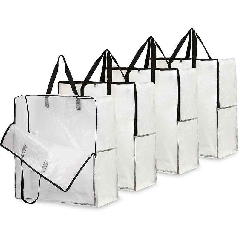 SET DI 4 BORSE XL TRASPARENTI E RESISTENTI: cerchi un kit per il trasloco? O hai bisogno di comode borse portaoggetti per il garage, la soffitta o il seminterrato? Questa borsa trasparente XXL è un'ottima soluzione per tutte le tue esigenze di archiviazione e un'ottima alternativa alla solita scatola da trasloco e questa borsa extra large per indumenti o biancheria e protegge i tuoi effetti personali da polvere e umidità < p>PER CONSERVARE TUTTO: Ti stai muovendo? O hai bisogno di una borsa porta abiti o di una borsa di grande formato per riporre i vestiti estivi durante i mesi invernali? Questo set portabiancheria è molto versatile e perfetto per riporre scarpe, vestiti o anche per riporre l'albero di Natale e le decorazioni fino al prossimo anno. Con questo set di 4 borse portaoggetti con cerniera xxl, avrai la soluzione perfetta per tutte le tue esigenze di conservazione o trasporto TRASPARENTE PER VEDERE COSA C'È DENTRO: Queste borse XXL sono molto capienti e perfette per riporre
