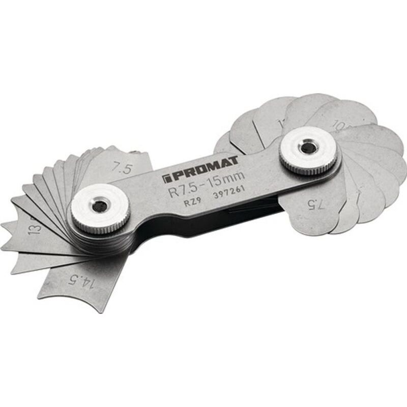 Sagoma per raggi PROMAT (1,0-7 mm / 17 fogli) - 4000851415 Numero articolo 31-144-001 EAN 4015448410553 Peso di spedizione 2,00 kg DESCRIZIONE Acciaio - Calibri concavi e convessi con dado di bloccaggio - Per il controllo dei raggi interni ed esterni Ulteriori informazioni tecniche: - Raggio: 1,0-7 mm - Numero di lame: 17 pezzi.