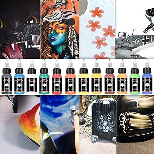 I colori per aerografo set includono 30 ml (1 oz) x 12 colori: nero, bianco titanio, giallo centrale, arancione rosso, giallo limone, rosso scarlatto, verde medio, rosa, grigio chiaro, blu, blu cerulean, blu oltremare, verde giallo. Ha una gamma di colori e un colore trasparente aerografo, è possibile mescolare per creare colori personalizzati per creare bellissimi colori.