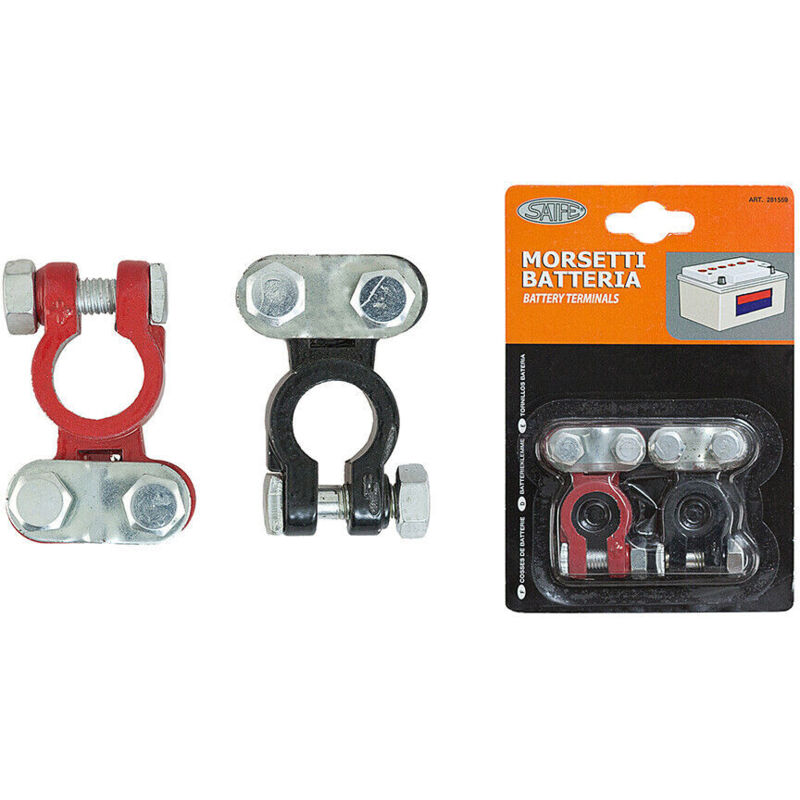 Dispositivi meccanici per il collegamento elettrico dei poli della batteria con i 2 cavi di alimentazione dellimpianto elettrico del veicolo (il cavo rosso da collegare al polo positivo e quello nero da collegare al polo negativo della batteria). Analogamente ai cavi, i morsetti batteria sono di due tipologie: positivo (quello rosso) e negativo (quello nero).