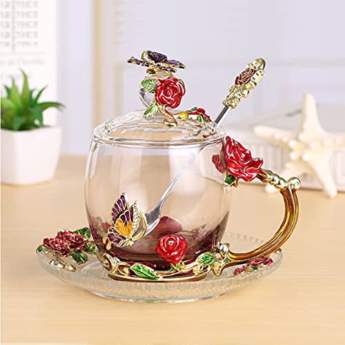 Saijer Smalti Tazza da tè Fiori Farfalla, Cucchiaio e Coperchio Tazza da tè ai Fiori Vetro Cristallino Tazza da Tisana di Camomilla Può Essere Utilizzato per Preparare tè o Caffè