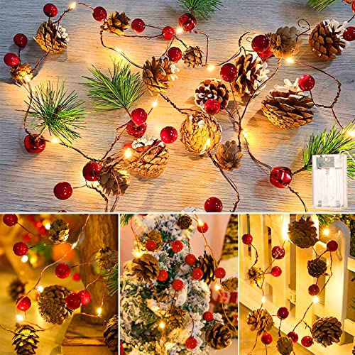 SaiXuan Luci di stringa di Natale con pigna Campana di bacche rosse, ghirlanda con luci 20LED Luce bianca decorata a batteria per decorazioni natalizie per feste natalizie