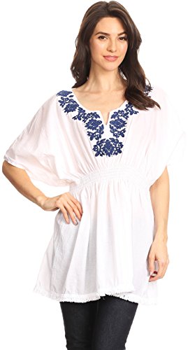 Sakkas 5303 - Octavia Smocked Dolman Manica Camicetta Fringe con Collo Split e Ricamo - Bianco/Navy - OS