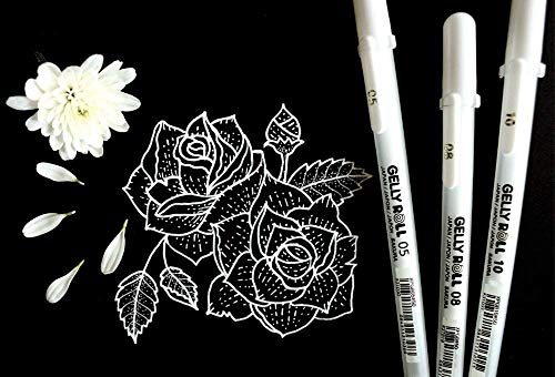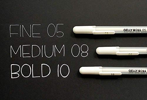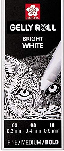 Sakura Gelly Rotolo. Inchiostri bianchi a punta sottile (0,5 mm), medi (0,8 mm) e oleosi (1,0 mm) che possono essere utilizzati su superfici scure o per aggiungere riflessi. Fornisce un flusso costante di inchiostro fino all'ultimo tratto Sakura Gelly Rotolo. Nessun attrito, sfumatura o sanguinamento sulla maggior parte delle carte