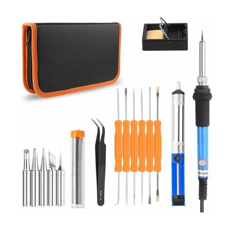 Kit completo 8 IN 1: il kit viene fornito con un saldatore, 5 punte di saldatura, un supporto con una spugna per la pulizia, una ventosa per saldatura (pompa dissaldante), 6 strumenti ausiliari intercambiabili, un filo per saldatura, pinzette antistatiche e un cacciavite br/> Si riscalda rapidamente: il kit di saldatore superiore adotta la tecnologia di riscaldamento in ceramica a riscaldamento interno, la temperatura regolabile con un intervallo di termostato di 200-450, la grande capacità termica, il rapido trasferimento del calore e il rapido recupero del calore consentono di lavorare rapido ed efficiente 3 Design unico: design resistente al calore e agli urti della filettatura della vite in modo che la testa di ferro non sia facile da far cadere, l'indicatore LED sarà un buon indizio per evitare bruciature accidentali, il gel di silice isolante sul ferro può proteggere efficacemente il ferro dalla stiratura ad alta temperatura Pezzi versatili: il la pompa dissaldante è un