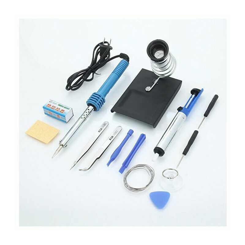 Kit saldatore portatile - - Il kit saldatore, 18 in 1, viene fornito con custodia per il trasporto, spelafili, pinze, cacciavite, pompa dissaldante, pinzette, fili, ferro da stiro, 2 spugne, saldatura da 50 g, stoppino per saldatura da 75 cm e 5 diverse punte per saldatore. Questo è il tuo pacchetto iniziale di saldatura all-in-one 【Riscaldamento rapido, dissipazione rapida del calore】 - Kit di saldatura per saldatore da 60 W, utilizza la tecnologia ceramica di riscaldamento interno e la velocità di riscaldamento è estremamente elevata. Il kit saldatore di precisione, la temperatura regolabile con un intervallo di termostati di 220 ~ 480 ℃ consente agli utenti di controllare efficacemente il calore come desiderano. Con le quattro prese d'aria, il calore si dissipa rapidamente 【Ampia applicazione】 - Questo kit saldatore è perfetto per i principianti nella saldatura. La borsa degli attrezzi multifunzionale è adatta a tutte le esigenze del tuo progetto di saldatura e facile da