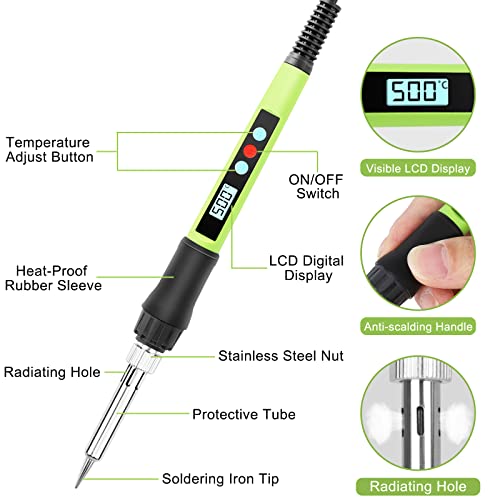 Saldatore elettronico a LED e manico resistente al calore: il saldatore con display a LED ad alta risoluzione mostra chiaramente lo stato della temperatura. Il manico resistente al calore può isolare efficacemente la temperatura ed è più adatto per lavori di saldatura e riparazione a lungo termine. Raccomandato da molti principianti, fai da te, professionisti.