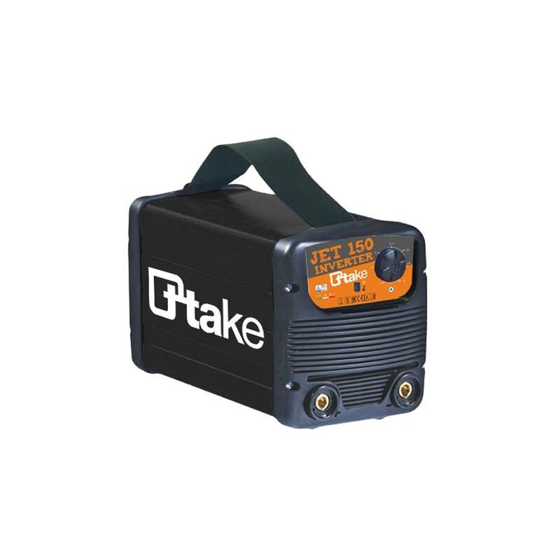 Saldatrice TTAKE JET 150 con tecnologia ad inverter, per saldatura MMA adatta per elettrodi rutilici, basici, inox, ghisa. Dotata delle funzioni: HOT START, ARC FORCE e ANTI STICK. Ventilata, verniciata con vernice antigraffio, adatta all'impiego con motogeneratori (tolleranza tensione ingresso +/-15%) Saldatrice fornita in valigetta con incluso i seguenti accessori: - Maschera a mano - Martospazzola - Cavo con pinza di massima - Cavo con pinza portaelettrodo. Dettagli tecnici: - Fattore di servizio: 15-135 Amp. - Potenza assorbita 60% - 2,6 KVA - Elettrodi utilizzabili: MMA diametro 1,6 - 3,25mm - Dimensioni: 350x200x280 mm - Peso: 6,7 kg - Accessori inclusi: maschera a mano, martospazzola, cavo con pinza di massa, cavo con pinza portaelettrodo.