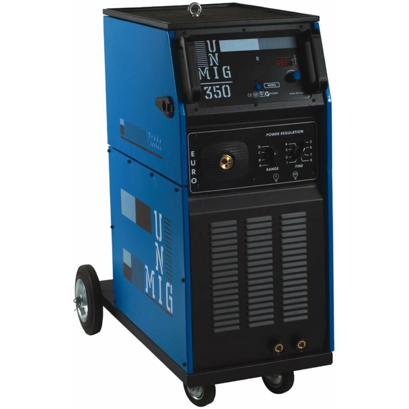 La Saldatrice Unimig 350 della Awelco adatta per una saldatura a filo continuo con o senza gas di copertura a protezione, comunemente chiamata MIG o MAG, fa uso di un generatore di corrente in AC che riproduce una corrente a basso voltaggio e molti ampere i quali sono usati per formare un arco voltaico, questo mediante il suo calore fa fondere il metallo dei pezzi da saldare ed il materiale di apporto costituito da un filo continuo . La saldatura MIG/MAG con o senza gas viene utilizzata quando è richiesta un'alta produttività ed una sufficiente flessibilità di impiego. Dotata di scheda a microprocessore con funzionalità Burn Back-Rampa-TimerOn. Accessoriata con riduttore gas Micromax e torcia attacco Euro diretto . Specifiche Tensione di rete 3 PH 50/60 Hz 400V Potenza assorbita 60% 5,1 KVA Tensione a vuoto 17 - 44 V Corrente di saldatura 30 - 350 A Fattore di servizio 35% 350 A Fattore di servizio 60% 240 A Fattore di servizio 100% 190 A Regolazioni 32 Bobina filo Ø 100 - 200