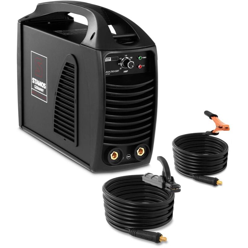 Di marca Stamos Pro Series ✅ Modello: S-MMA 250.IGBT ✅ Articolo: 10020203 ⬇️ Caratteristiche principali per la riparazione e la manutenzione in postazioni fisse e mobili Versatile: saldatrice MMA con manopola per elettrodi da 1,6 a 5 mm alloggiamento in lamiera d'acciaio verniciata a polvere costruzione compatta e robusta la funzione Hot-Start facilita l'accensione dell'arco ⬇️ Dettagli tecnici Ciclo di servizio [%] 60 Potenza in ingresso [kVA] 7,8 Potenza in ingresso max. [kVA] 9,9 Classe di isolamento F Corrente di ingresso massima [A] 43 Corrente di saldatura max. [A] 250 Corrente di saldatura min. [A] 20 Corrente nominale in entrata [A] 34 Tensione [V] 230 Protezione IP IP21 Manuale Sì Arc Force No Anti-Stick No Hot Start Sì Cavo MMA 8 m Cavo di messa a terra 8 m ⬇️ Descrizione del prodotto Con la saldatrice MMA 250.IGBT di Stamos Germany ti aspetta un dispositivo professionale, innovativo e di alta qualità per lavori di riparazione e manutenzione. La saldatrice si adatta