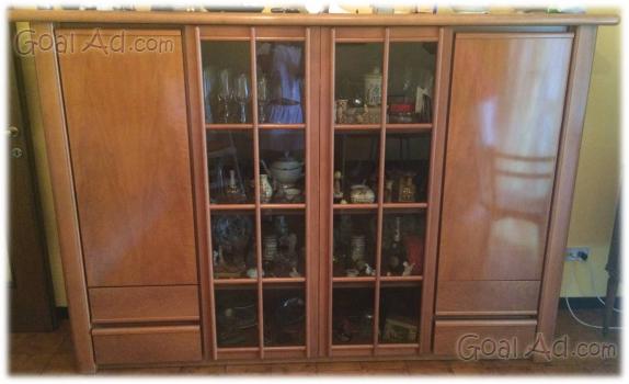 1. Parete attrezzata simmetrica con elementi centrali a giorno a 4 vani ed eleganti antine in legno e vetro trasparente; elementi laterali composti di anta (internamente tre capienti vani intramezzati da ripiani coordinati in legno di noce) e due cassetti.
