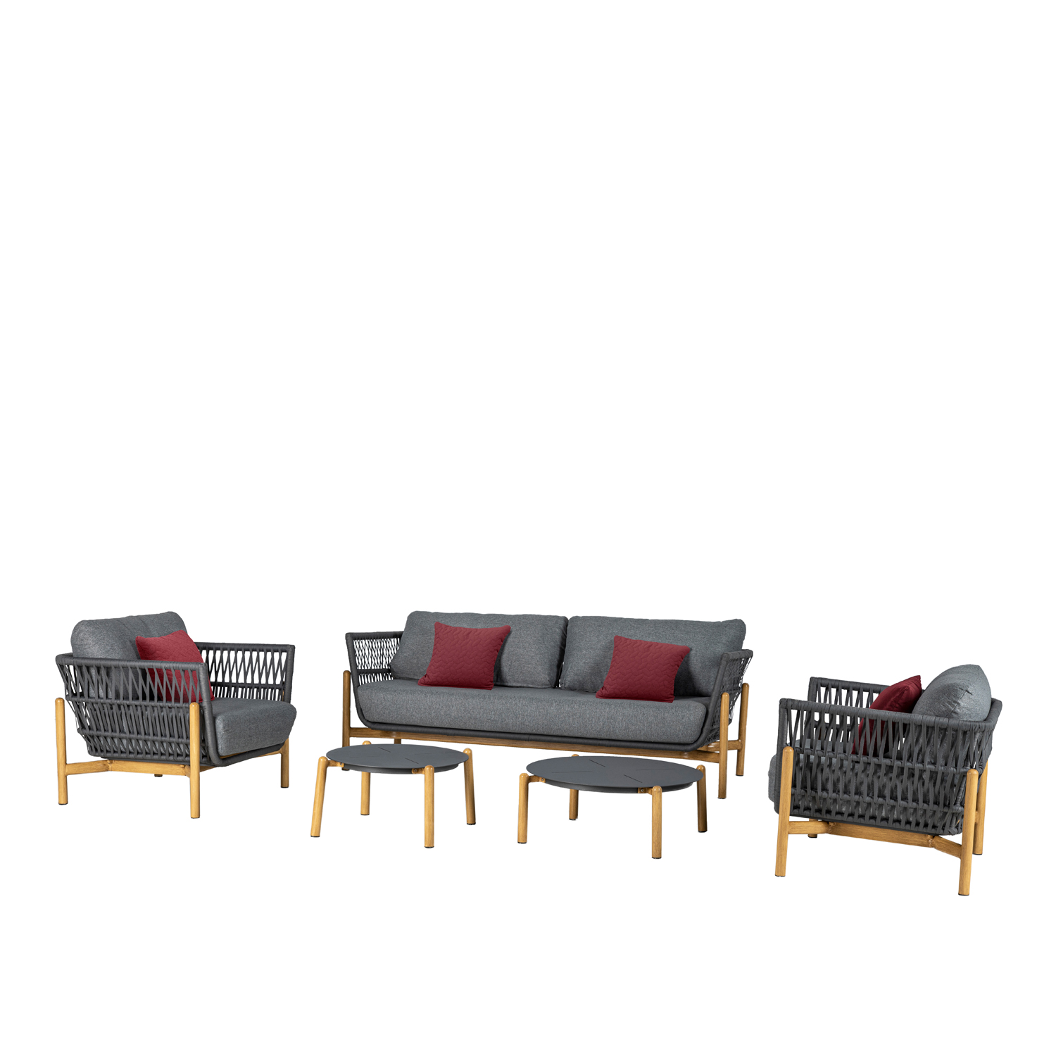 Completa i tuoi spazi esterni rendendoli funzionali e ricchi di stile con questa affascinante soluzione d'arredo per 4 persone. Il soggiorno Rubby è caratterizzato da morbide sedute imbottite color grigio che creano un piacevole contrasto con la struttura intrecciata dal colore naturale. Nel set è incluso un divanetto a 2 posti, 2 poltrone con braccioli e due piccoli tavolini da caffè per appoggiare riviste, drink e tutto ciò che vuoi a portata di mano nelle tue ore di relax. I cuscini sono rivestiti con tessuto idrorepellente che lascia scivolare l'acqua piovana senza impregnarsi e sono facilmente sfoderabili per un pratico lavaggio. La struttura è resistente ai raggi UV con trattamento epossidico antiruggine. Se vuoi conservarlo più a lungo, proteggila con una copertura speciale e riponila in luogo asciutto e riparato in inverno. Misure divanetto: 186x71xh80 cm, 2 poltrone: 80x80xh71 cm, tavolino grande: 72x32 cm, tavolino piccolo: 58x28,5 cm.