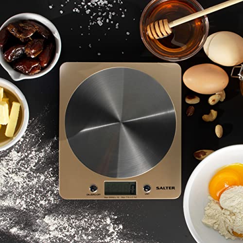 Salter 1036 OLFEU16 - Bilancia elettronica a disco, serie Olympus, 5 kg, sottile ed elegante, piattaforma in acciaio inox, Aggiungi e pesa, misurazione di liquidi e fluidi, oro/acciaio inox