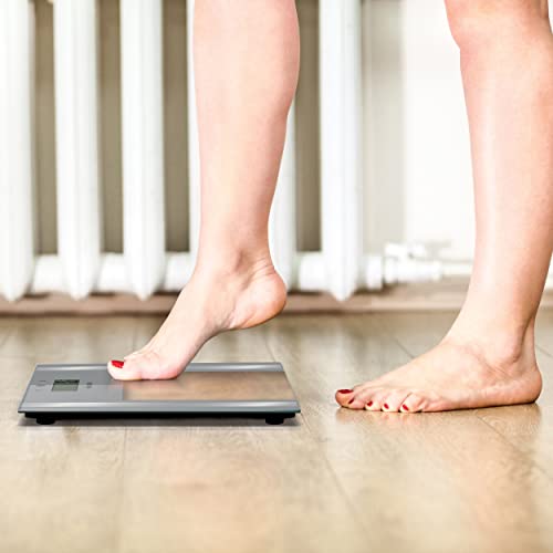 DESIGN SOTTILE: Questa bilancia da bagno ha un design sottile di soli 2,5 cm di altezza, per riporre comodamente e in modo compatto il bagno. Include 2 batterie AAA per iniziare subito.