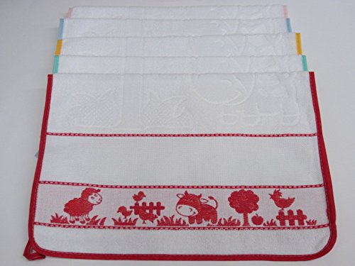 Salvietta in spugna bianca 100% cotone con lavorazione di simpatiche mucchine. Bordo con sbieco in cotone. Inserto in tela aida bianca 72 fori altezza 7,5 cm. Nella parte superiore della salvietta c'è la scritta "Nella vecchia fattoria", mentre sotto la fascia ricamabile è raffigurato il paesaggio tipico della fattoria con la mucca, il gallo, le galline coi pulcini, gli alberi da frutta, i recinti per contenere gli animali. Appendino per appenderla. Dimensioni: 42x54 cm circa.
