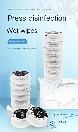 【Salviette umidificate e asciutte portatili pressate】 Il design della separazione bagnata e asciutta fa sì che le salviettine umidificate non perdano umidità durante l'uso. Al momento dell'uso , Premere il centro con il pollice e lasciare che le salviette si alzino, il che attiva le salviette per rendere la pulizia delle mani più facile e comoda.