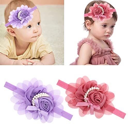 SamHeng 2 Pezzi Bambino Fascia di Chiffon, Elastico Fiore di Rosa Archi Perla Cerchietto per Capelli per Neonati, Ragazze Fascia per Capelli Copricapo Accessorio per Capelli per Bambini (Rosa+Viola)