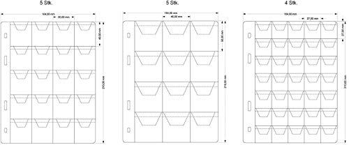 14 buste trasparenti per monete senza plastificanti e acidi: 5 fogli per monete con 12 scomparti per monete (46 x 50 mm) per monete grandi come ad esempio 5, 10, 20 eurocent, 5 fogli per monete con 20 scomparti per monete (35 x 40 mm) per monete di medie dimensioni come 1, 2 eurocent, 50 Eurocent, 1 eurocent, 1 eurocent, 1 eurocent, 1 eurocent, 1 eurocent, 1 eurocent, 1 eurocent, 1 DM, 2 DM, 2 M, 1 CHF, 50 pence, 4 fogli per monete con 35 scomparti per monete (27 x 27 mm) per monete piccole come ad esempio 1, 2, 5, 10 e 20 eurocent