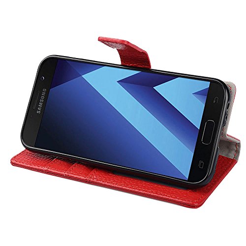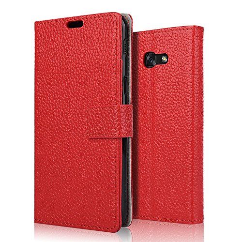 Samsung Galaxy A5 2017 Custodia - Rosso Litchi-grano Vera Pelle per Samsung Galaxy A5 (2017) Custodia, (Pelle Bovina 100% Puro Cuoio) Protettivo Custodia Con Cinturino da Polso Magnetico Book Style Internamente Silicone TPU Custodie Case in Pelle Protettiva Flip