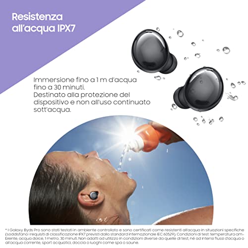 Galaxy Buds Pro gode di livelli di protezione IPX7 per la protezione da sudore e acqua: usali anche all'aperto in una giornata piovosa. Sono adatti a immersioni fino a 1 m d'acqua fino a 30 minuti