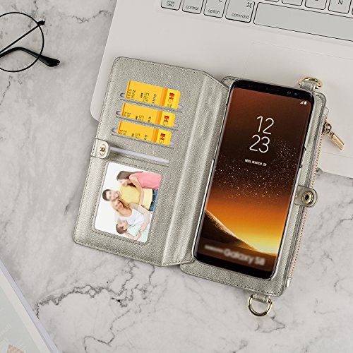 Samsung Galaxy Note 8 Custodia Pu Portafoglio Protettiva in pelle per P Bookstyle Flip Cover Stand Case,Vandot Portafoglio Donna,casual Crossbody tracolla, borsa messenger,Porta Carte di Credito, Cover Custodia per Samsung Galaxy Note 8,Portafoglio Donna, Abbigliamento in Pelle di Moda Portafogli Foglia d'oro Hollow Grande Capacità Cerniera Zipper, Wristlet Borsetta Custodia Samsung Galaxy Note 8, Ragazze,Capodanno, regali ragazza, San Valentino,Argento