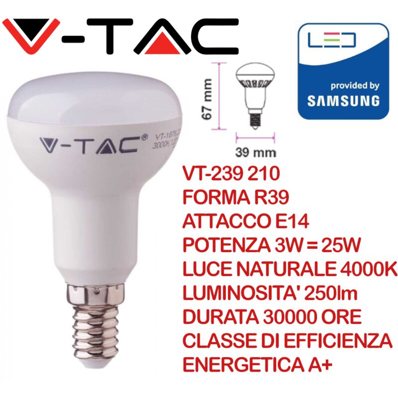 Lampadina a LED da 3W ed in grado di sviluppare un'intensità luminosa di 250 Lumen che può essere paragonata ad una lampadina tradizionale da 25W. Con attacco E14, forma R39 e dimensioni 67 x 39 mm, ha un efficienza energetica di classe A+. Costruita in termoplastica questa lampadina a LED ha una finitura opaca che le permette un irraggiamento della luce di 120°. Garantita 5 anni e con una durata di 30000 ore è un'ottima soluzione in qualsiasi contesto che va dalla semplice abitazione ad alberghi e ristoranti. EAN 3800157631761 Colore della luce 4000K Potenza 3W Tipo di Attacco E14 Forma R39 Flusso luminoso 250 lm Tensione alimentazione AC ( 220 - 240 ) V Angolo di Diffusione 120° Colore Bianco Materiale Termoplastica Grado di Protezione IP20 Dimmerabile No Potenza equivalente 25W Frequenza di input 50Hz Durata 30000 ore CRI >80 PF >0.4 Tipo di chip LED SMD SAMSUNG Efficienza energetica 80 lm/W Dimensioni 67 x 39 mm Peso 25 g Classe di efficienza energetica A+ Cicli On/Off >20000