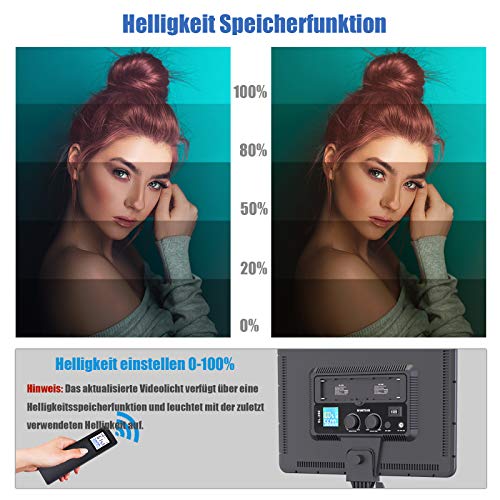 Display LCD bicolore: la luce video ha due temperature di colore (3200 K (caldo) e 5600 K (bianco), la luminosità può essere regolata in modo continuo (0% - 100%), per soddisfare diverse scene e diverse modalità di ripresa. I parametri per la luminosità e la temperatura del colore vengono visualizzati chiaramente sullo schermo LCD, in modo da poter lavorare in modo semplice ed efficiente.