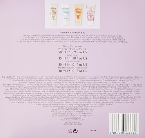 Questo regalo include: 50 ml di miracolo di umidità della pelle umida, balsamo per il tallone da 35 ml, crema mani da 30 ml e lavaggio viso a scoppio di umidità da 30 ml