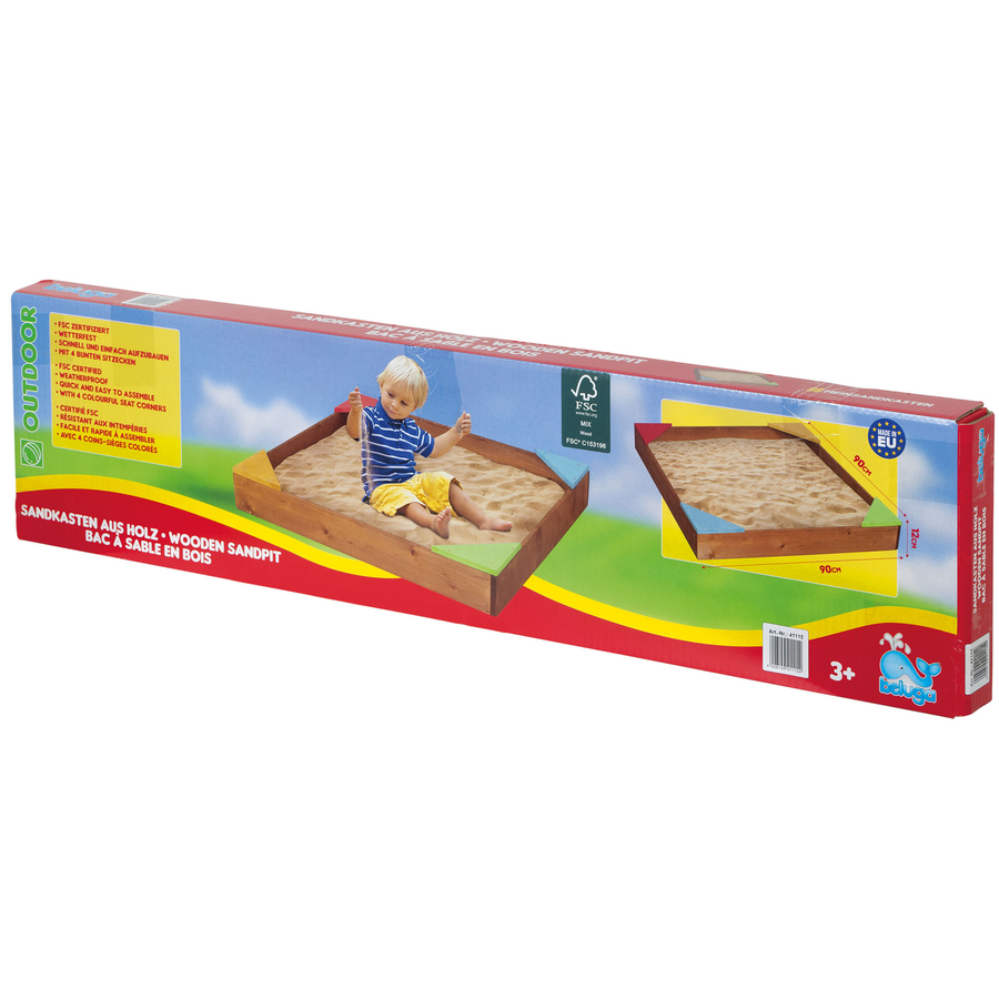 Sand Scatola di legno con 4 posti a sedere colorati. dettagli del prodotto: Dimensioni (lunghezza x larghezza x altezza): 90 cm x 90 cm x 12 cm Materiale: Legno Età: a partire da 3 anni Attenzione! Non adatto a bambini di età inferiore ai tre anni. Rischio di soffocamento dovuto a piccole parti che possono essere ingerite.
