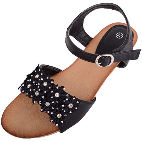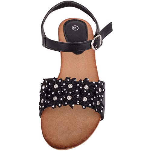 Sandali da donna con strass e motivo floreale, estivi, con zeppa e chiusura a fibbia, Nero, 38 EU