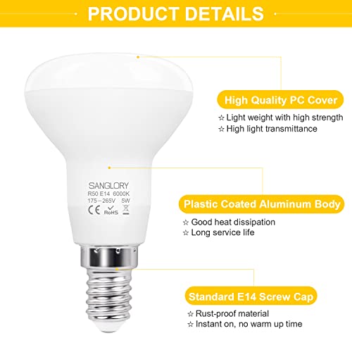 SanGlory Lampadine LED E14 R50 Riflettore, E14 LED 6000K Bianca Fredda, 5 Watt Equivalente a Alogena 40W, 510LM, 120 Gradi di Luce, Lampade Faretti LED R50 Non-dimmerabile, 6 Pezzi