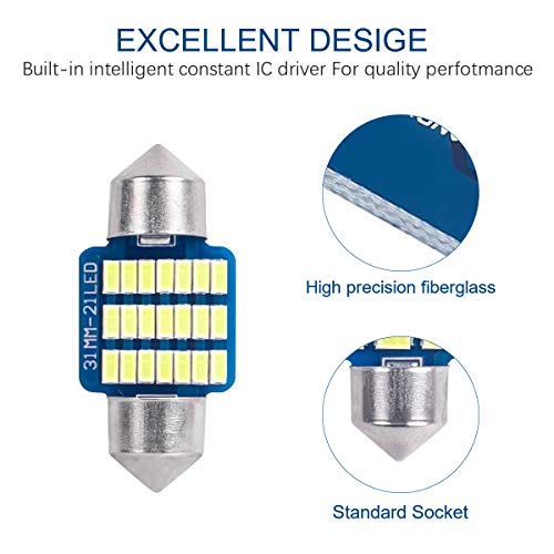 ✿ Alta qualità: 6 pezzi 31mm c5w lampadine a LED. Ogni lampadina contiene 21 SMD Chip tecnologia 3014 ultra luminoso LED, bianco 6000K, 12v. Risparmio energetico, basso fuoco, nessun sfarfallamento, e nessun errore nel computer di bordo. ★ NOTA: il perfetto funzionamento potrebbe non essere compatibile con Fiat Panda, Fiat 500, Audi A5, Audi B8 e l'ultimo veicolo europeo.