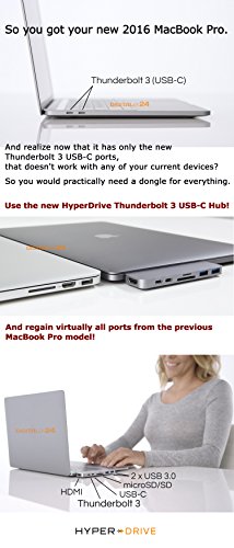 SANHO HyperDrive Thunderbolt 3 USB-C Hub for MacBook Pro 2016 [Model: GN28B-GRAY / Colour: SPACE GRAY / Grigio siderale]. Turns 2 USB-C ports into 7 ports: 4K HDMI, 40Gb/s Thunderbolt 3, USB-C, 2x USB 3.1, SD and microSD card reader, 100W pass-through charging. Compatible with 15” and 13” MacBook Pro 2016 with Thunderbolt 3 ports (with and without Touch Bar). Offer from Digitalix24
