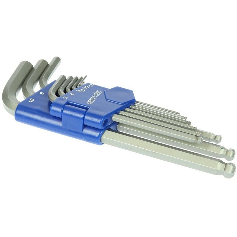 Il lungo gioco chiave allen sferico-headed è fornito con un supporto brevettato. grazie alla testa sferica, le chiavi sono ideali per l'uso in luoghi di accesso difficili. Materiale: Vanadio cromato Anche: 311810540 Contenuto: 9 pezzi