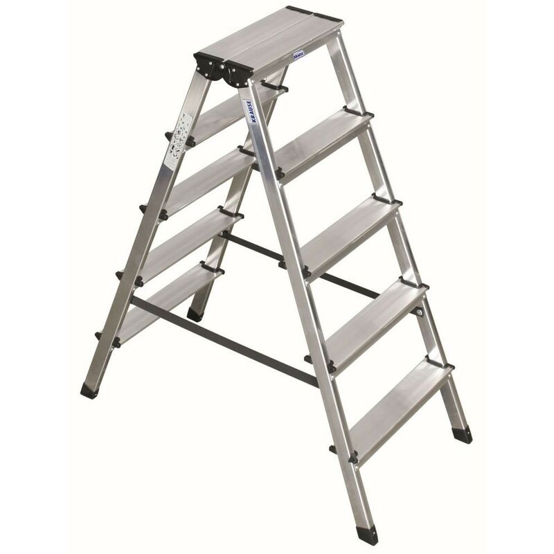 Il robusto e manipolabile scab doppio alluminio può essere montato su entrambi i lati ed è dotato di due cinghie di sicurezza e sabot antiscivolo. La truffa può essere piegata fino a guadagnare spazio e può quindi essere posizionata negli angoli meno. I collegamenti a piedi/montaggio sono rivettati più volte e quindi particolarmente stabili. L'escabeau è ideale per l'uso universale in artigianato. Modello modello: 2 x 5 passi;