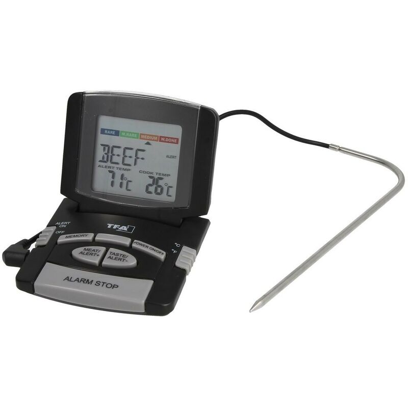 Termometro digitale per la preparazione ottimale della carne e del pollame monitorando la temperatura al cuore. Caratteristiche tecniche:- per forno o barbecue- ideale anche per la cottura a basse temperature- gradi di cottura pre-programmati secondo il tipo di carne: manzo, maiale, pollo, tacchino, vitello, prosciutto, anatre, costola, hachis